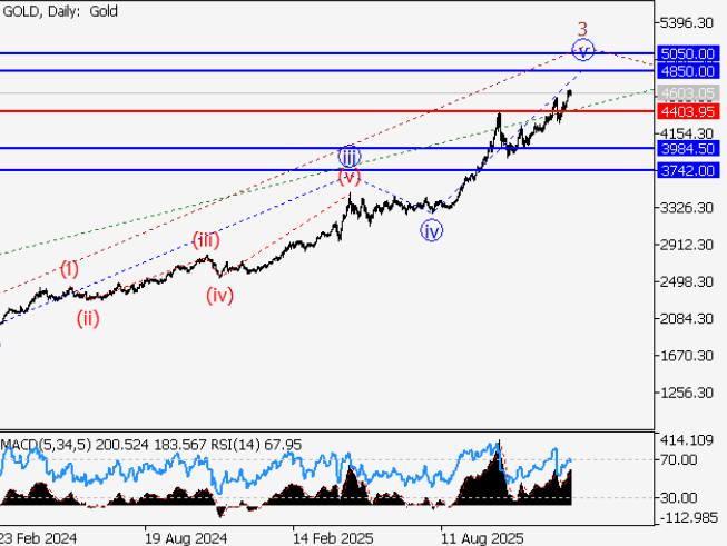 On the weekly chart, XAU/USD appears to be developing an ascending fifth wave of a larger-degree Wave 5. This phase often represents the final impulsive leg of a long-term bullish trend.