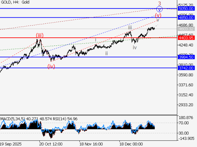 The upside projection toward 4,850.00 – 5,050.00 aligns with common Elliott Wave extension targets typically seen during the final stages of impulsive moves in commodities like gold.